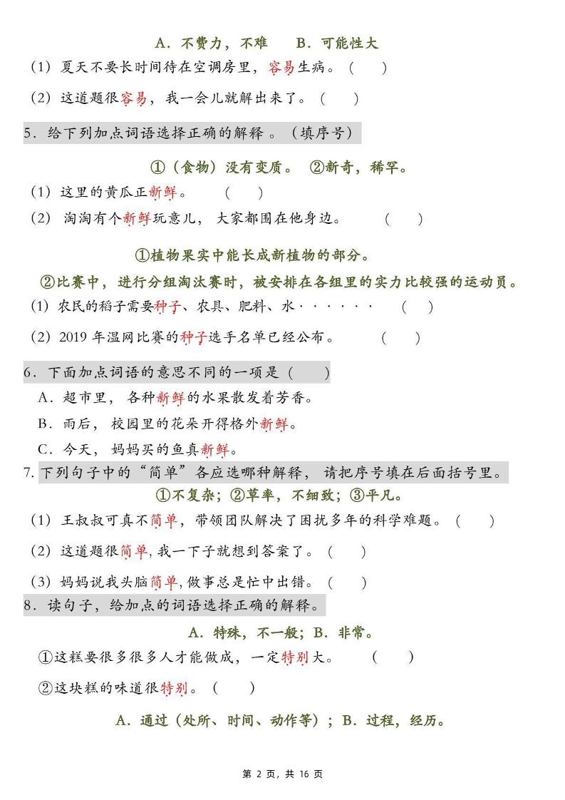 二下语文一词多义+四字词语专项练习(含答案16页)