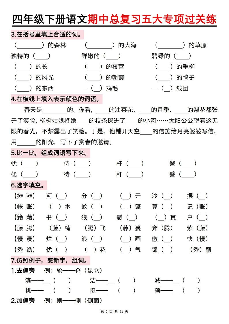 首页 > 全部 > 语文 > 【期中总复习五大专项过关练(空白)】四下语文