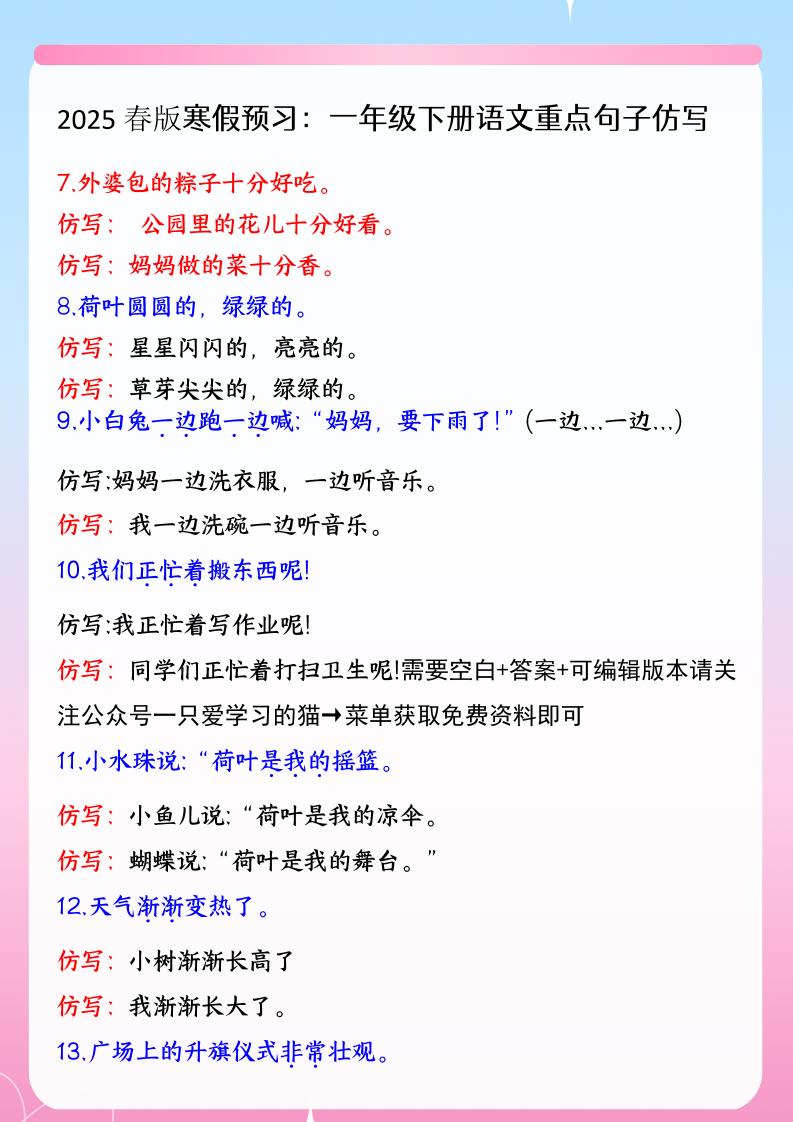 首页 > 全部 > 语文 > 2025春新版一年级下册语文重点句子仿写