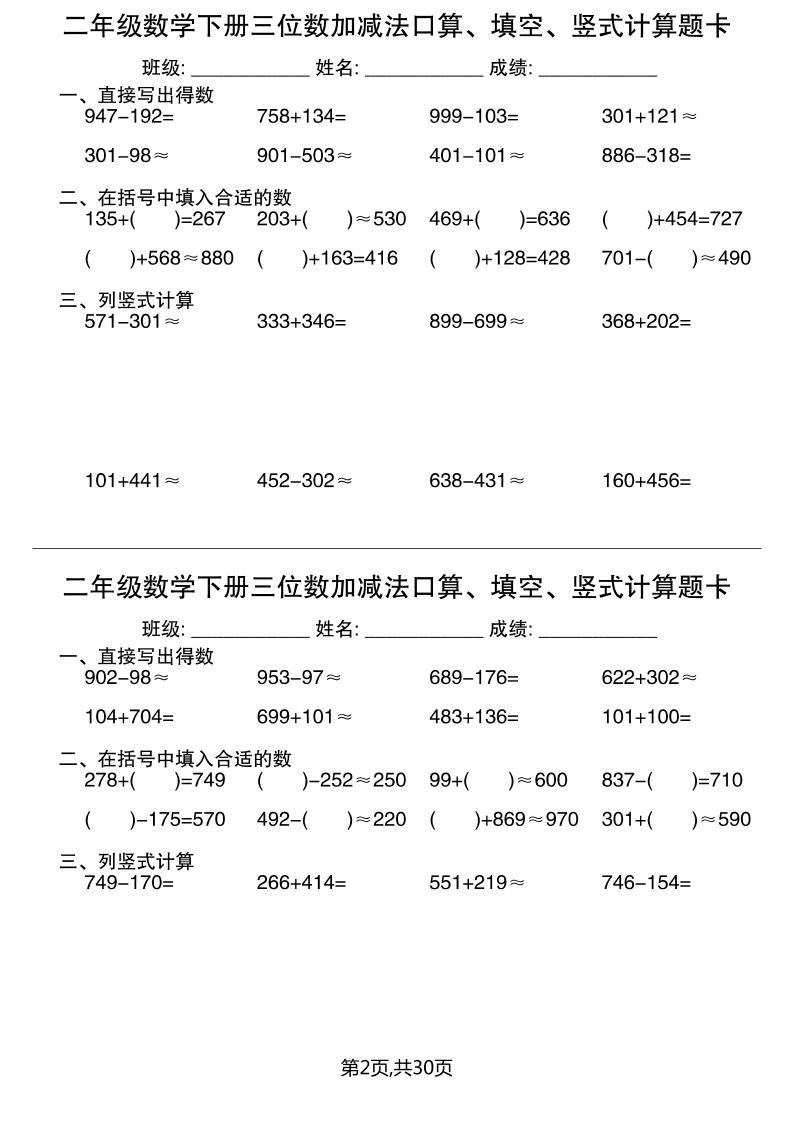 初级 二年级(下)数学三位数加减法口算、填空、竖式计算题卡