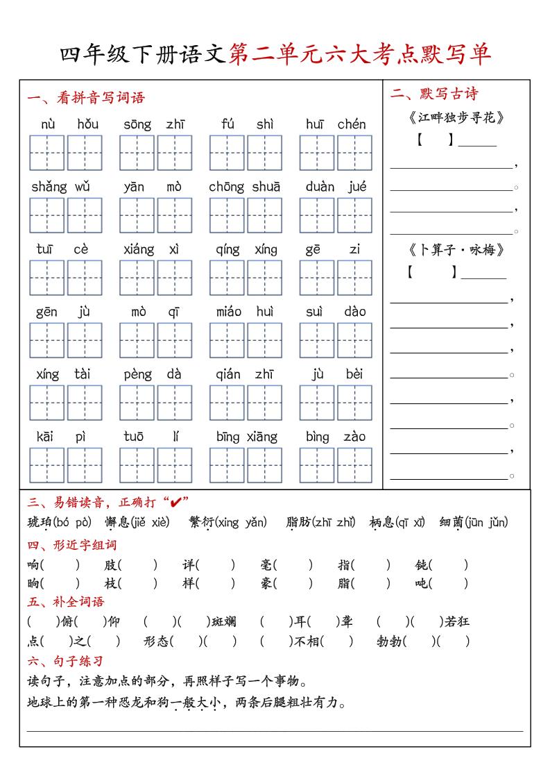 初级 四年级语文下册1-8单元考点默写单