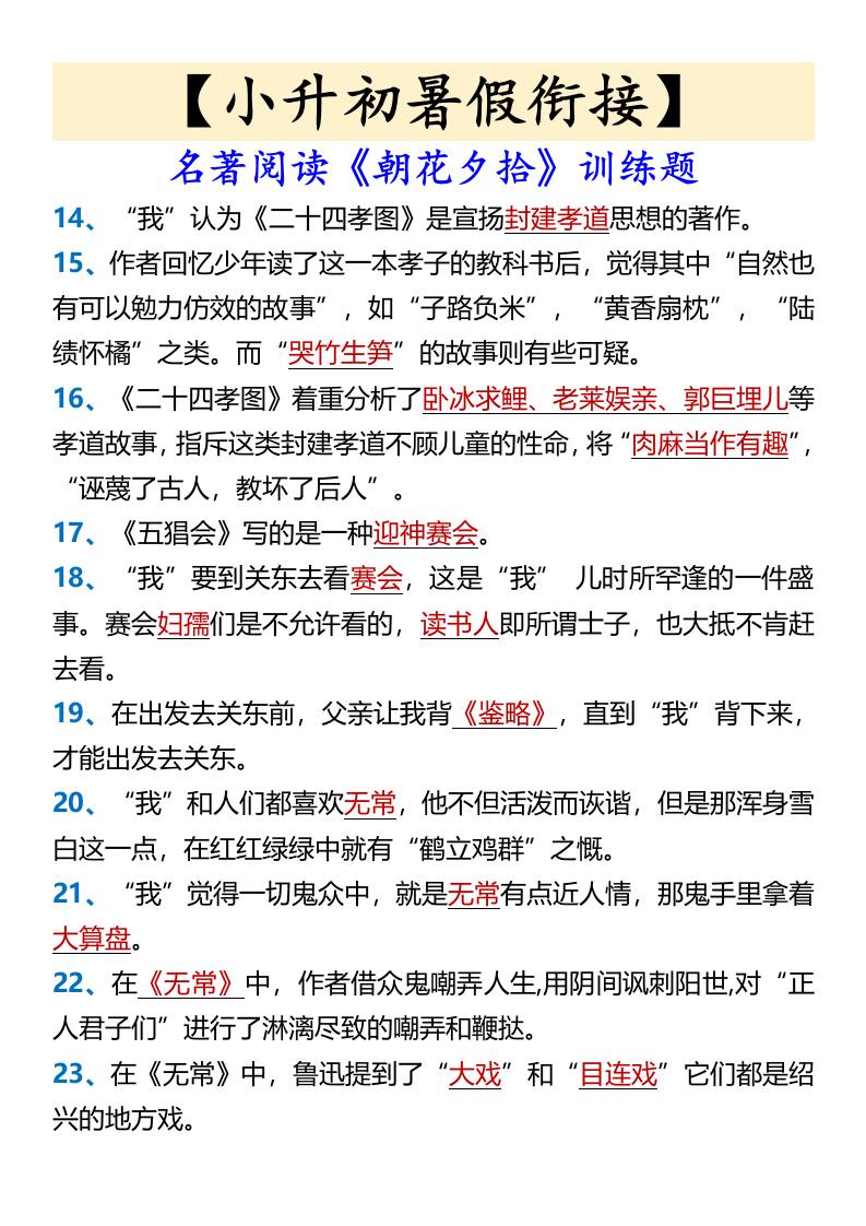 初级 【小升初暑假衔接】名著阅读《朝花夕拾》训练题-小升初语文
